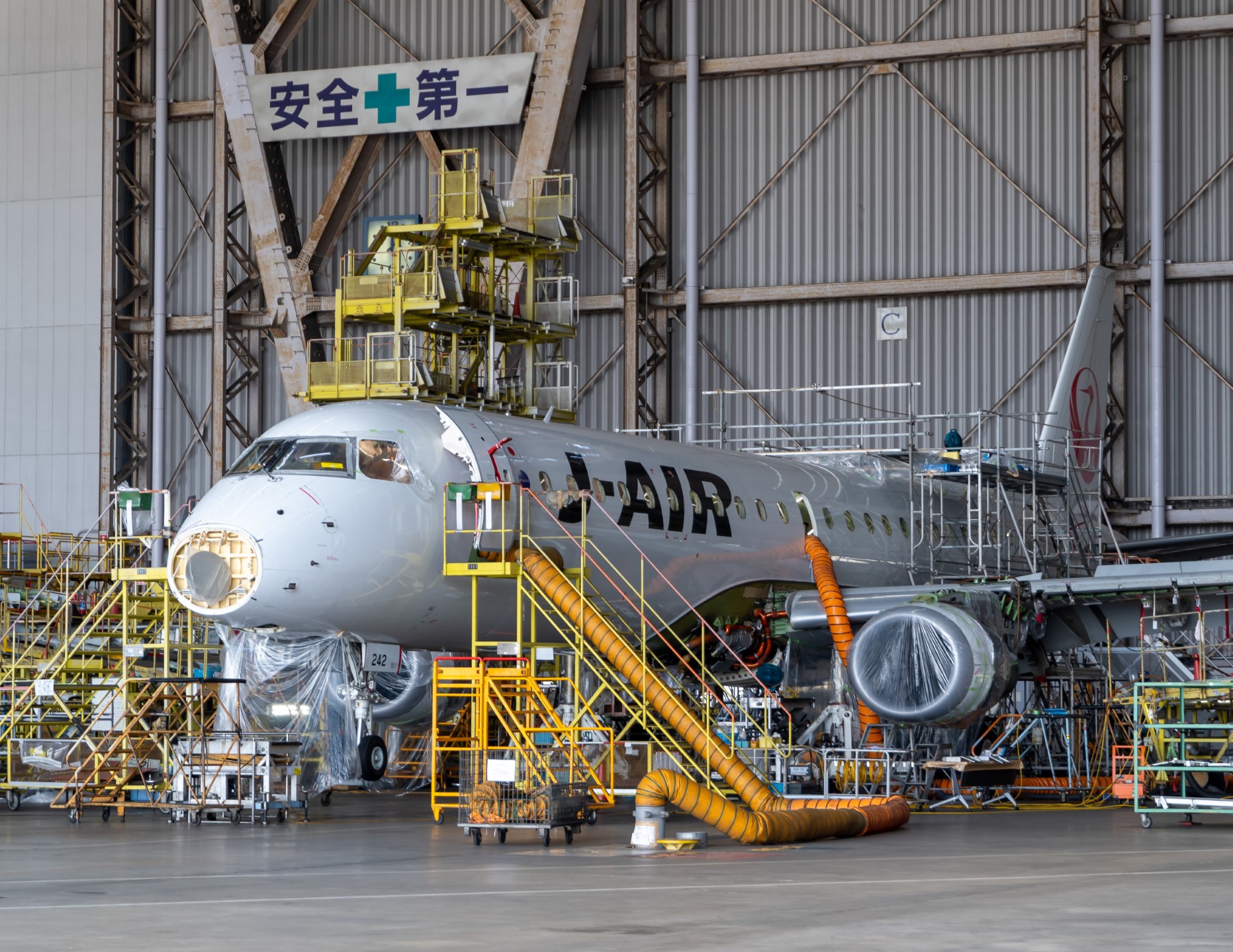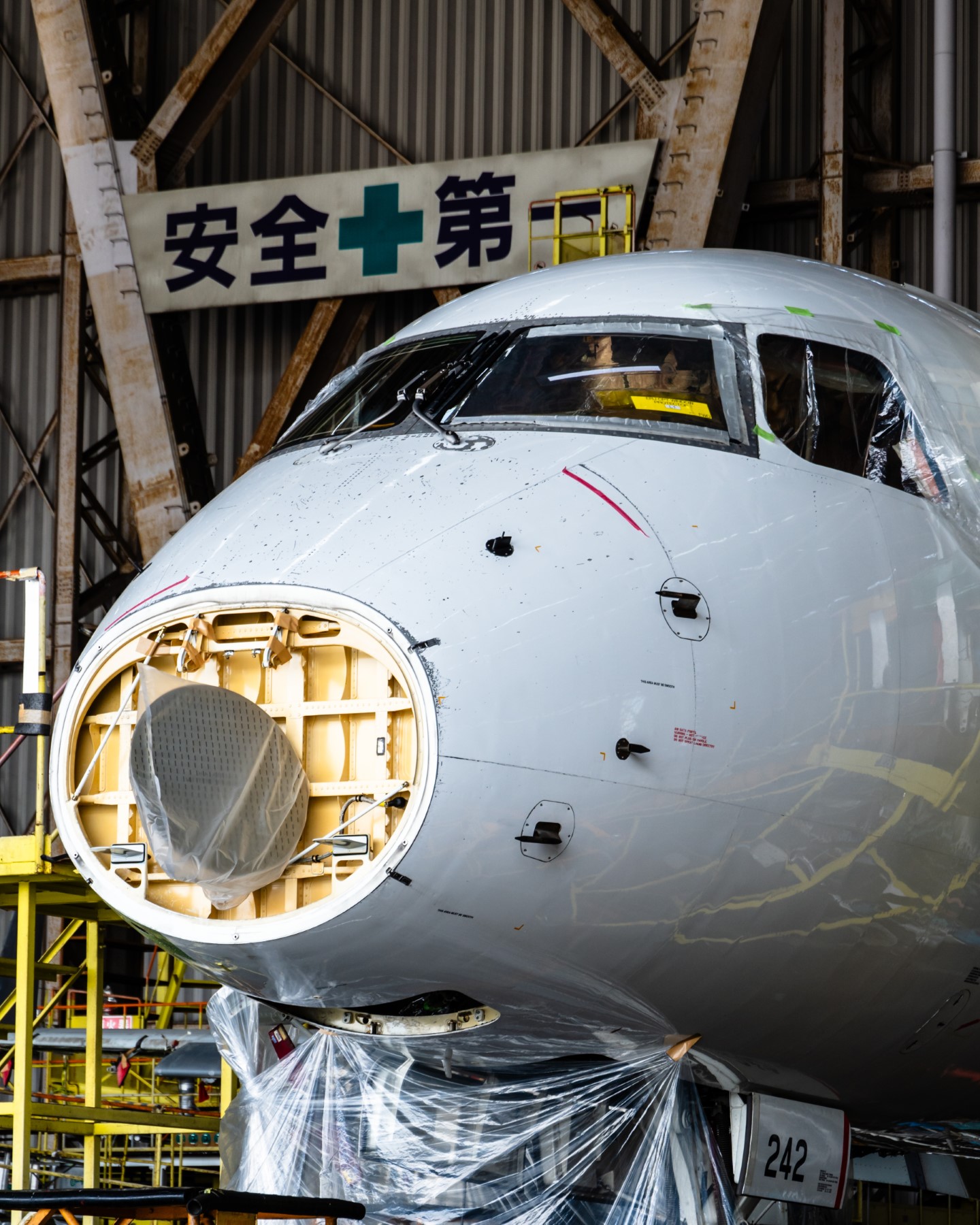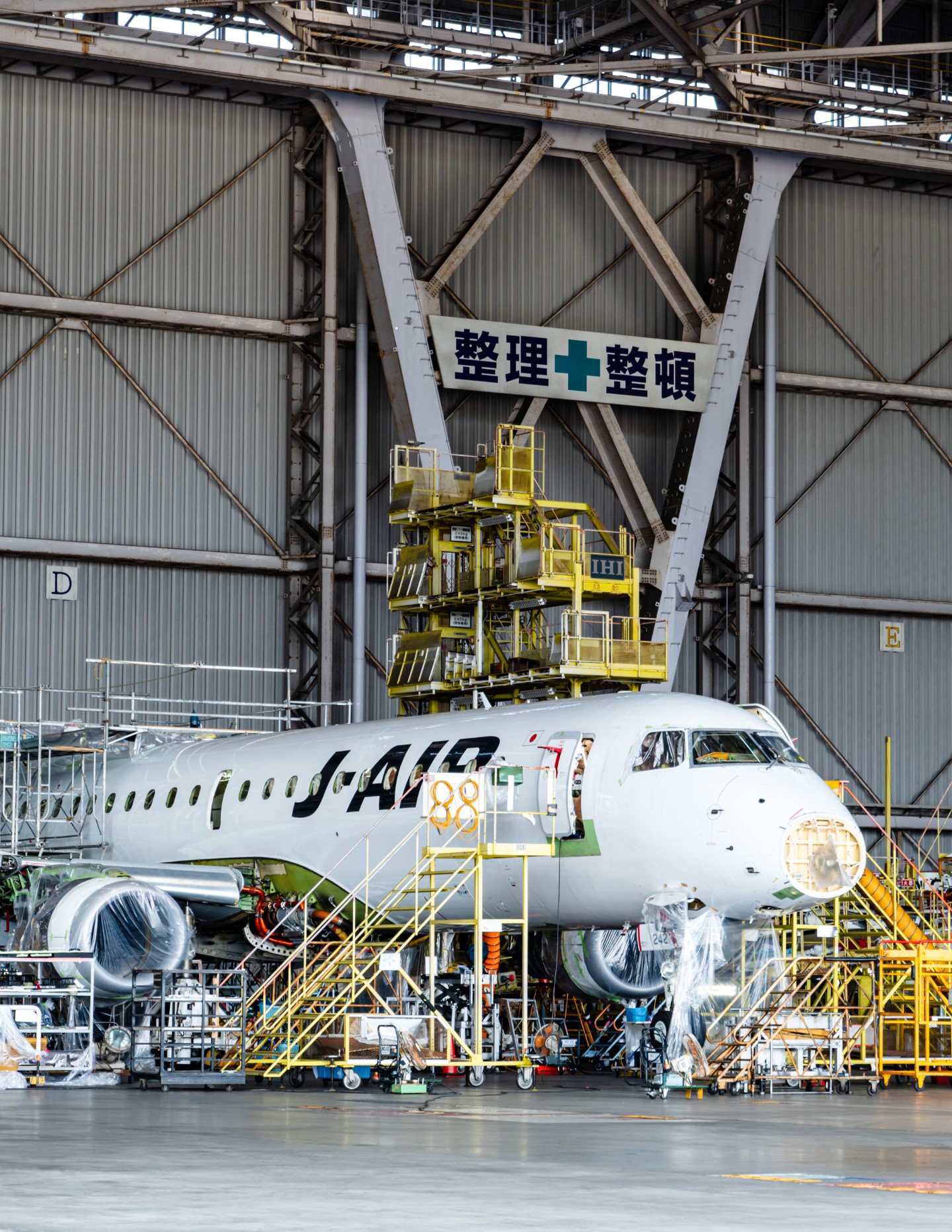 The second hangar had a non-JAL plane - they were very insistent on not taking any photos of that plane and so we all complied. We were also there just in time to see a 787 that had just finished being worked on and was getting pushed out of the hangar, and next to it there's an Embraer jet on some kind of heavy maintenance inside - most of the interior furnishings as well as exterior fairings were neatly stored around the plane. As the runway outside the hangar was used for landings that day the staff walked us right at the limit of the hangar, and gave us a running commentary of what the pilots would be doing as the planes came in for landing (as it turned out he was also a pilot).